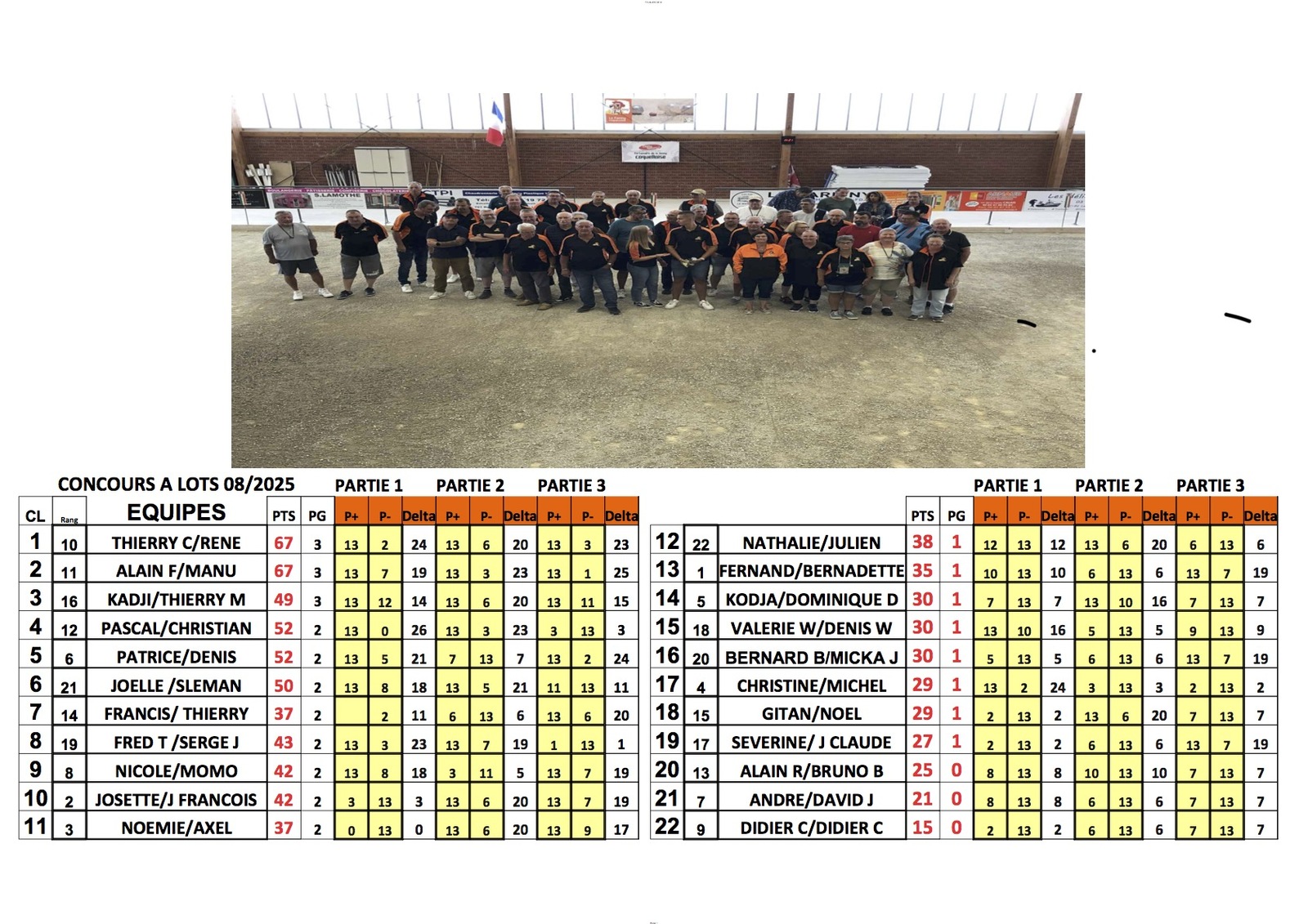 Concours interne de la Fanny – Samedi 30 août Le club La Fanny a organisé son concours interne à lots, réunissant 22 équipes en doublettes formées. Le tournoi s’est disputé sur trois parties « gagnant contre gagnant », offrant de belles rencontres serrées et conviviales. À l’issue de la compétition, les deux premières équipes sont : • Titi C. & René D. • Alain F. & Manu D. 👏 Félicitations à eux ! Tous les participants ont été récompensés : • Bons d’achats pour les premiers, • Un lot pour chaque joueur afin que personne ne reparte les mains vides. Un grand merci à toutes et à tous pour votre participation et votre bonne humeur. Le Comité